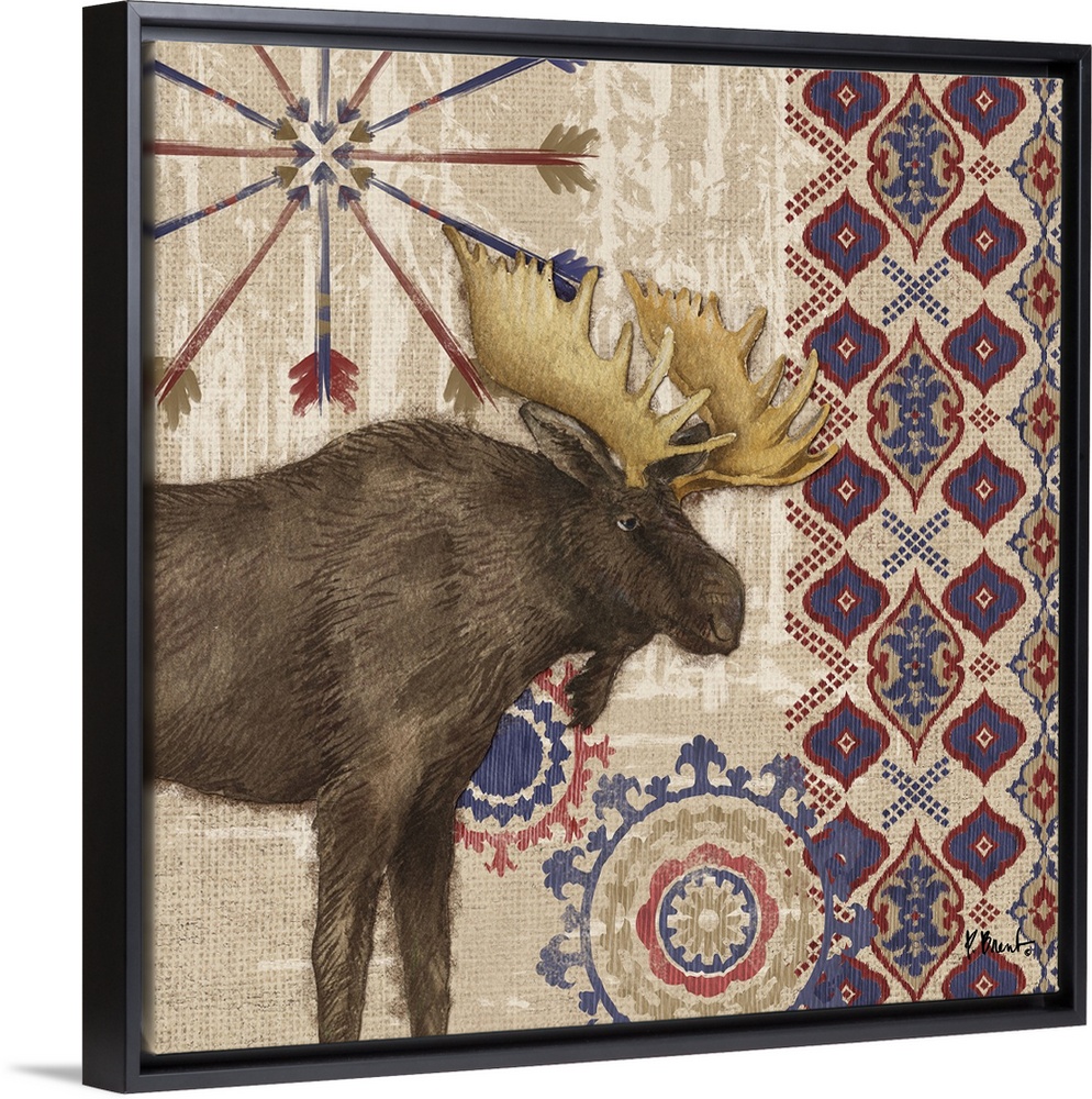 <p>Decorative artwork of a moose with folk patterns and arrows on a wood texture.</p>