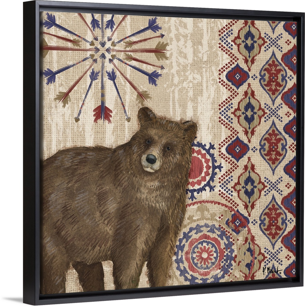 <p>Decorative artwork of a bear with folk patterns and arrows on a wood texture.</p>