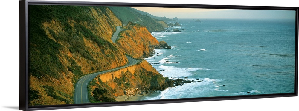 <p>Giant, landscape, panoramic photograph of Highway 1 curving through a cliffside near the shoreline in Big Sur, California.</p>