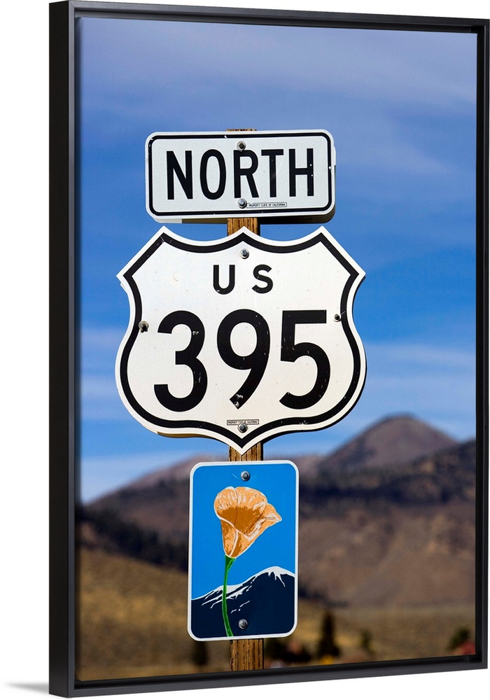 <p>An upward view of a Highway 395 North sign post including a California Scenic Highway sign.</p>