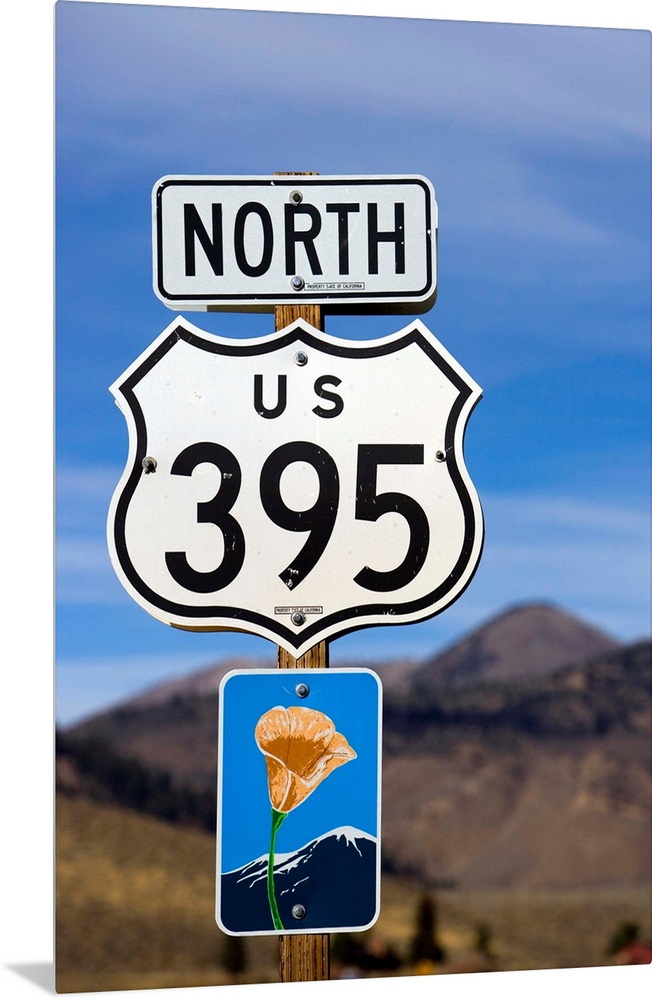 <p>An upward view of a Highway 395 North sign post including a California Scenic Highway sign.</p>