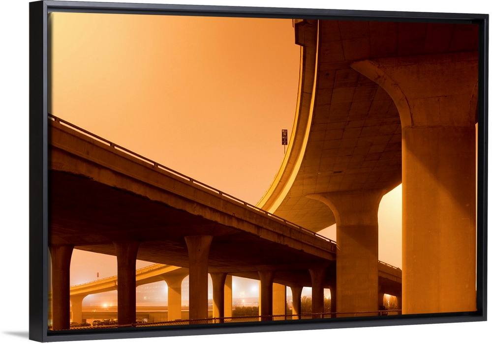 <p>Concrete supports of towering highway overpasses leading into downtown on a foggy spring night.</p>