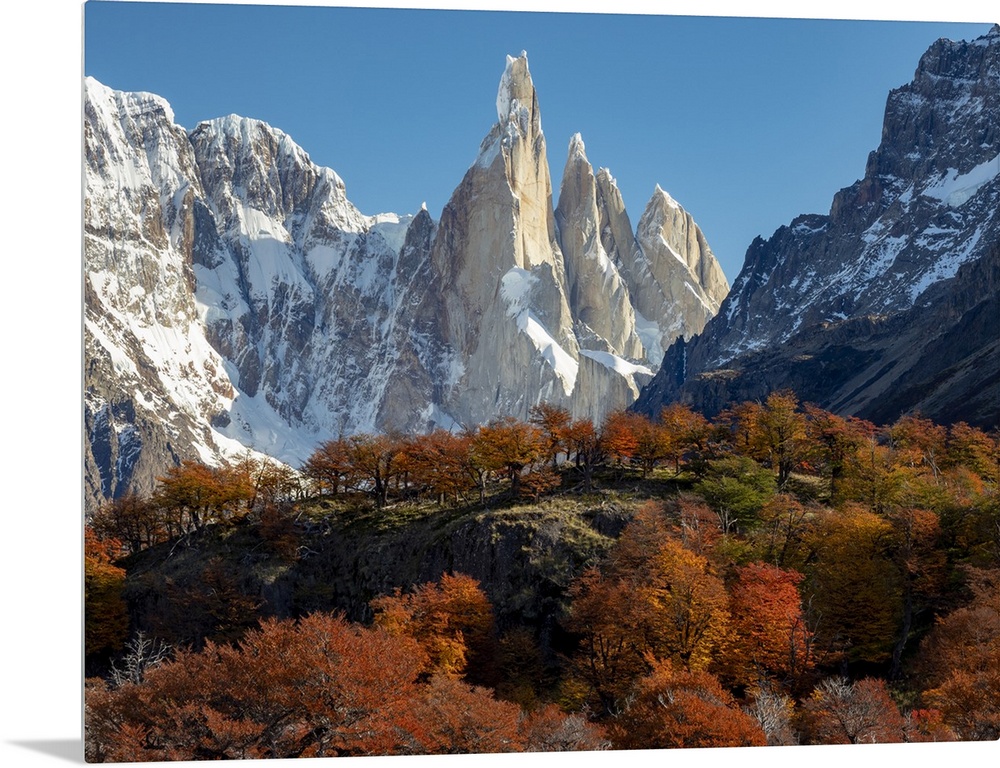 <p>Views along the day hike to Laguna Torre peak with fall color of southern beech, or Nothofagus trees in Los Glaciares National Park, El Chalten, Argentina</p>