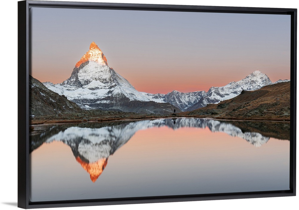 <p>Hiker admiring the Matterhorn reflected in the Riffelsee lake at sunrise, Gornergrat, Zermatt, canton of Valais, Switzerland, Europe</p>