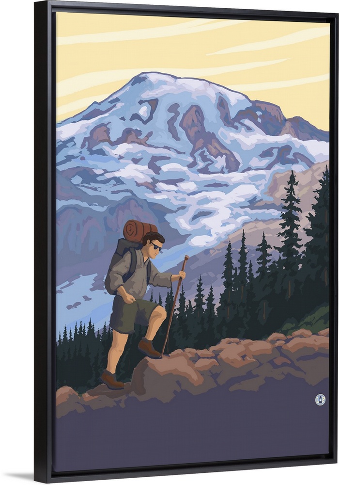 <p>Retro stylized art poster of a man hiking in the mountains.</p>