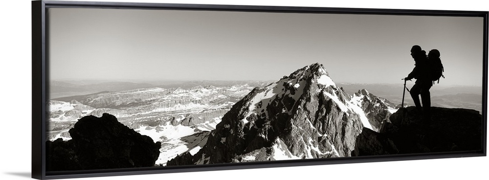 <p>This panoramic photograph shows mountain peaks and the silhouette of a climber surveying the landscape.</p>