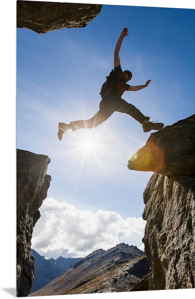<p>Backlit View Of Hiker Leaping Between Rocks Near Noatak River In The Brooks Range, Gates Of The Arctic National Park, Northwestern Alaska, Above The Arctic Circle, Arctic Alaska, Summer.</p>