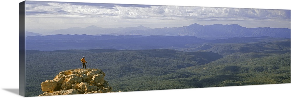 <p>Hiker standing on top of rock, Mogollon Rim, Pine, Gila County, Arizona, USA.</p>