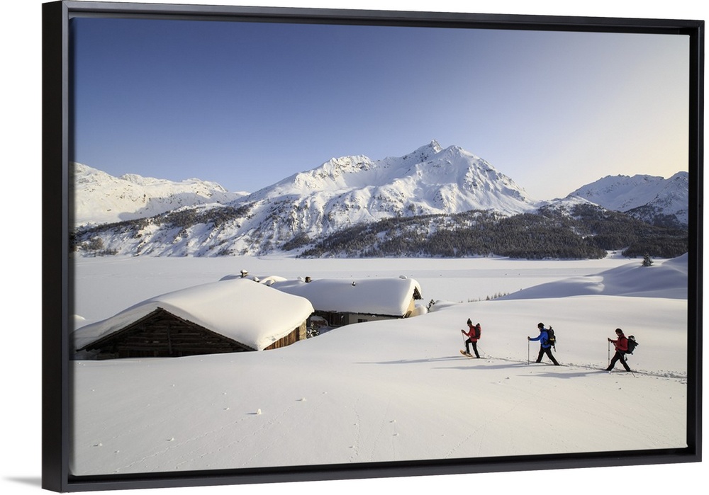 <p>Hikers on snowshoes, Spluga, Maloja Pass. Engadine. Switzerland. Europe.</p>