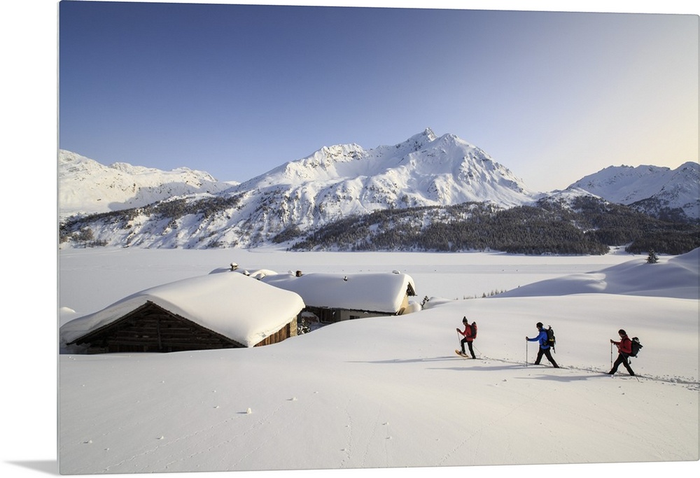 <p>Hikers on snowshoes, Spluga, Maloja Pass. Engadine. Switzerland. Europe.</p>