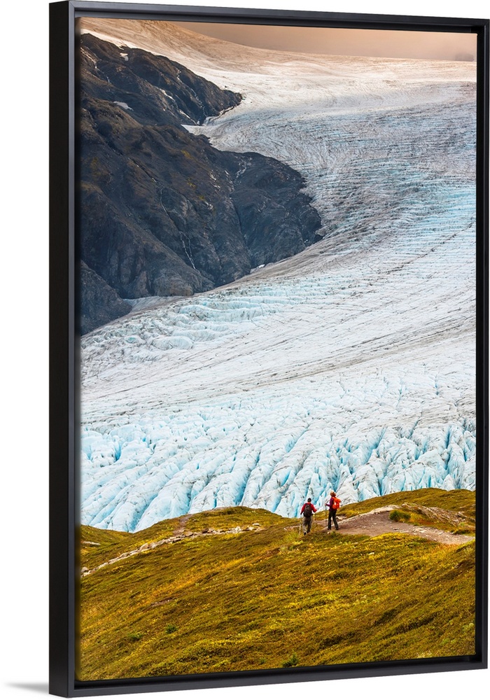 <p>A man and woman hiking down the Harding Icefield Trail with Exit Glacier in the background, Kenai Fjords National Park, Kenai Penninsula, Alaska.</p>