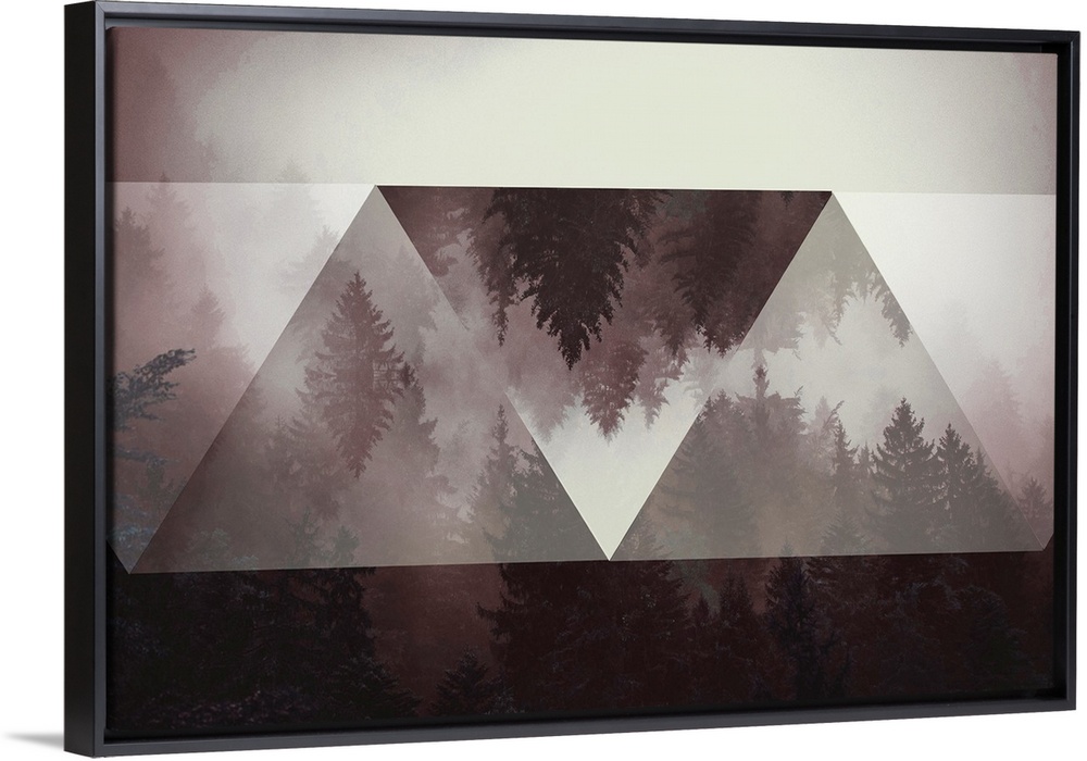 <p>Photo of a misty pine forest with abstract triangular shapes manipulating the image.</p>