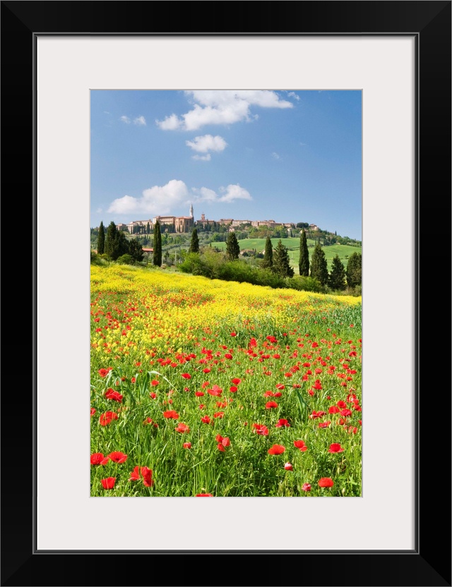 <p>Hill town Pienza and field of poppies, Tuscany, Italy</p>