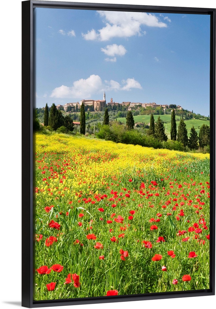 <p>Hill town Pienza and field of poppies, Tuscany, Italy</p>