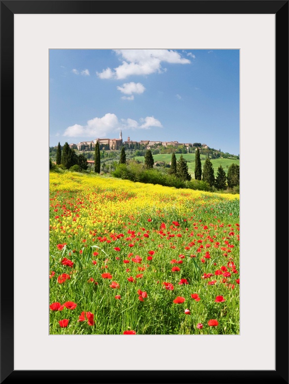 <p>Hill town Pienza and field of poppies, Tuscany, Italy</p>