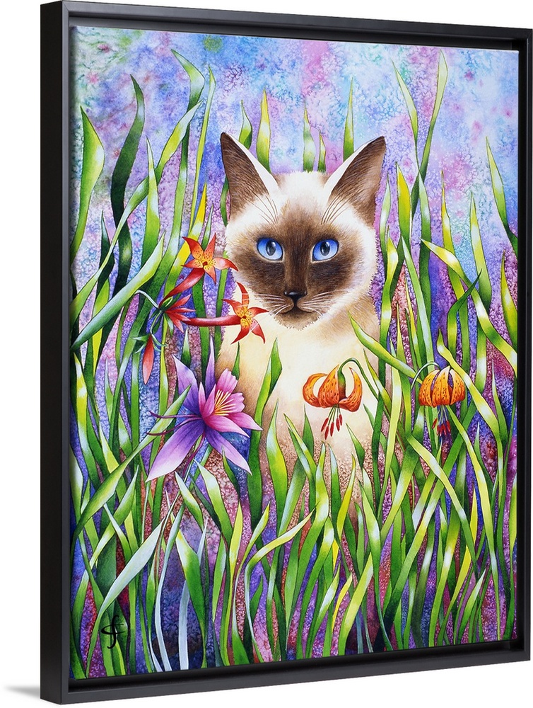 <p>Artwork of a cat doing some exploring through tall colorful grass and flowers.</p>