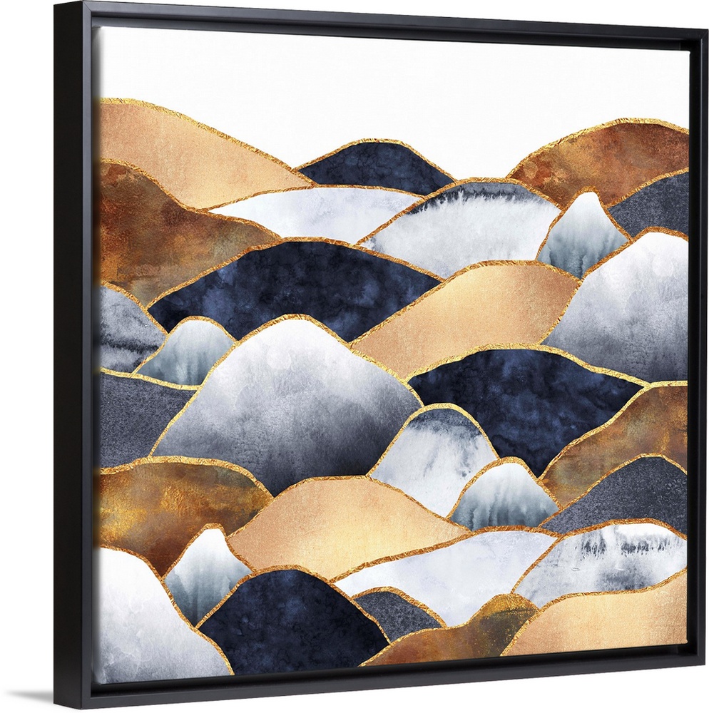 <p>Contemporary design of rounded peaks in shades of indigo, grey and copper; outlined in gold.</p>