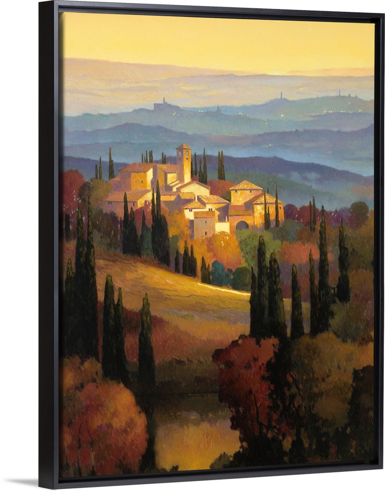 <p>This is a contemporary painting of the Tuscan countryside at sunset on vertical wall art.</p>