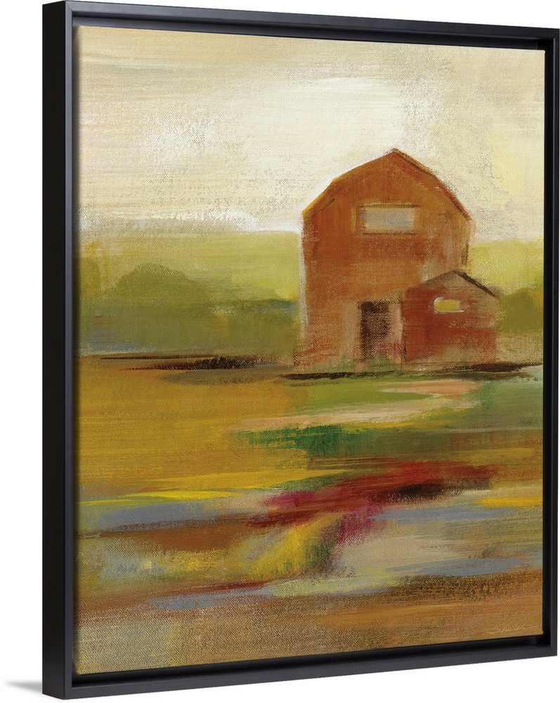 <p>Contemporary painting of a barn with an abstract landscape in an Autumn color palette.</p>