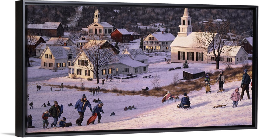 <p>People enjoying sledding down the big hill, with the town in the distance.</p>
