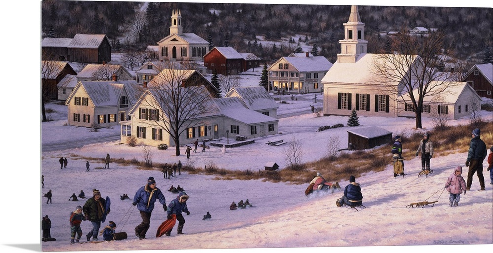 <p>People enjoying sledding down the big hill, with the town in the distance.</p>