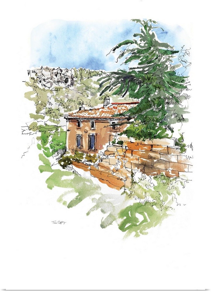<p>A lovely pen and ink rendering of a remote hillside home</p>