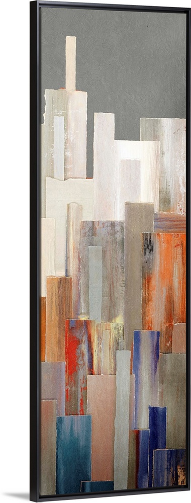 <p>A long vertical contemporary painting of multi colored buildings in a city.</p>