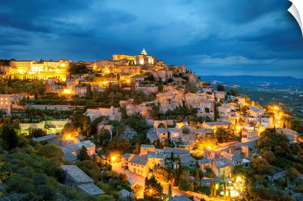 <p>Hilltop town of Gordes at dusk, Vaucluse, Provence-Alpes-Cote d'Azur, France.</p>