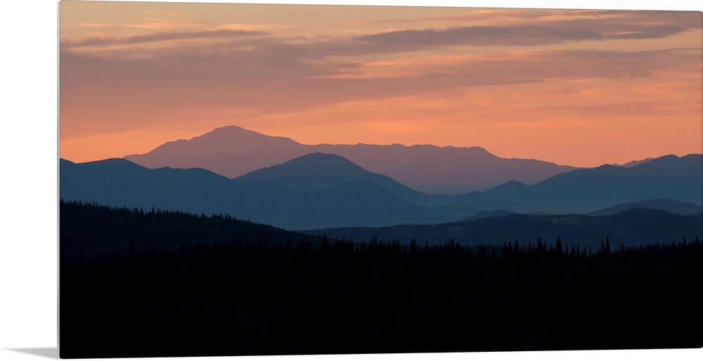 <p>Landscape photograph of a silhouetted mountain range at sunset.</p>