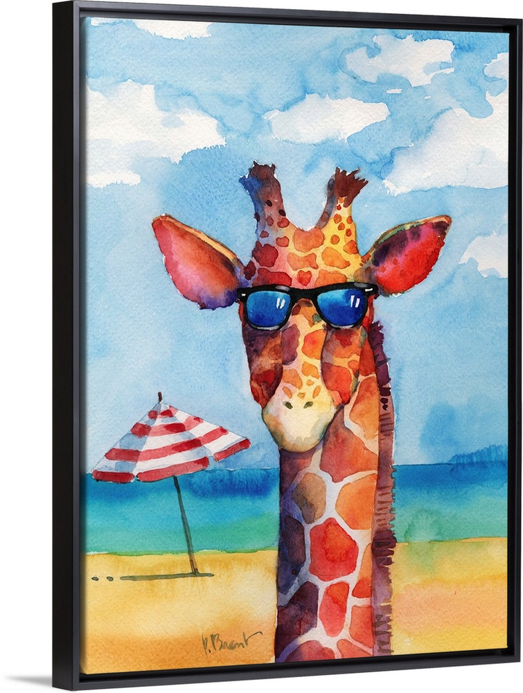 <p>Watercolor painting of a giraffe wearing sunglasses on a beach with the ocean in the background.</p>