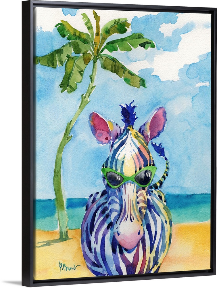 <p>Watercolor painting of a zebra wearing green sunglasses standing on the beach with a palm tree in the background.</p>
