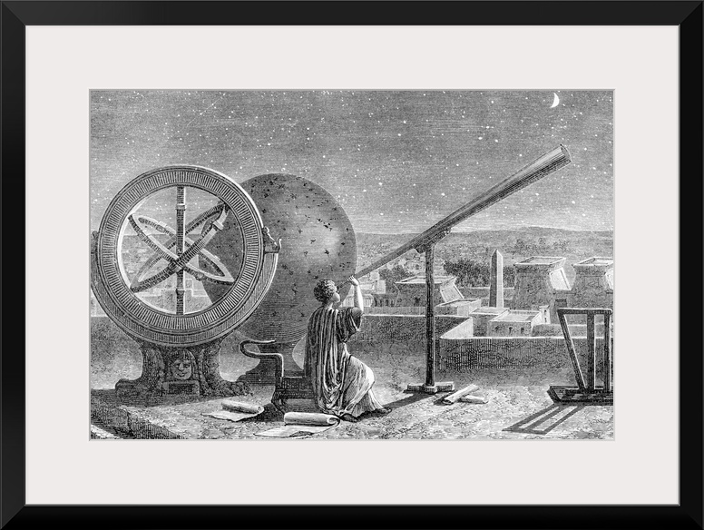 <p>Hipparchus (c.190-c.120 BC), Ancient Greek astronomer, at the Alexandria Observatory, Egypt. At left is the armillary sphere he invented. Hipparchus is considered one of the greatest astronomers of antiquity. He calculated the length of the year and discovered the precession of the equinoxes. It is thought that the later work of Ptolemy was based on the work done by Hipparchus. Engraving from Vies des Savants Illustres (1877).</p>