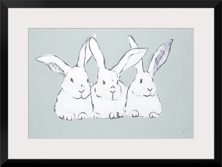 <p>A group of three white rabbits sitting side by side, with their ears up at alert.</p>
