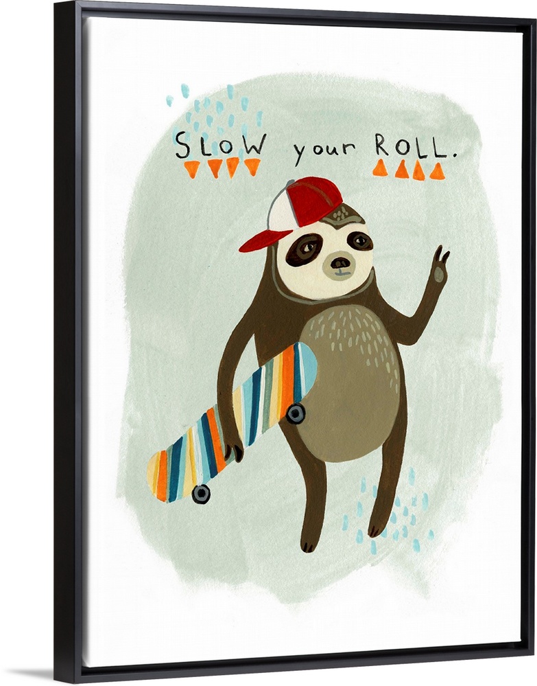 <p>Fun children's artwork of a hipster sloth with a skateboard and backwards cap.</p>