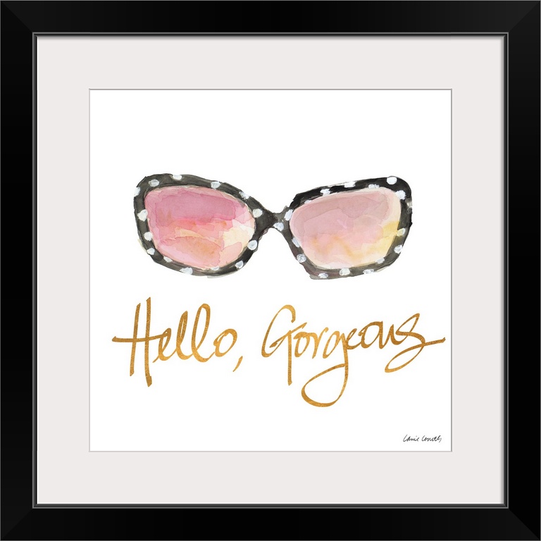 <p>Square watercolor painting of black and white polka dotted sunglasses with a pink and yellow reflection on the lens and the phrase "Hello, Gorgeous" written at the bottom in metallic gold.</p>