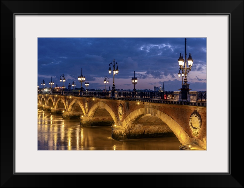 <p>Historic bridge, Pont de Pierre over the Garonne River at blue hour (dusk), Bordeaux, Gironde, Nouvelle-Aquitaine, France, Europe</p>