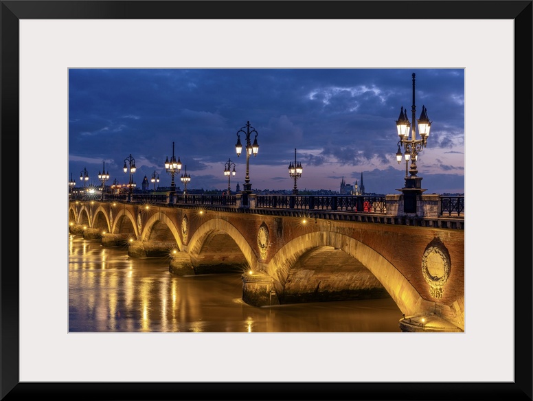 <p>Historic bridge, Pont de Pierre over the Garonne River at blue hour (dusk), Bordeaux, Gironde, Nouvelle-Aquitaine, France, Europe</p>