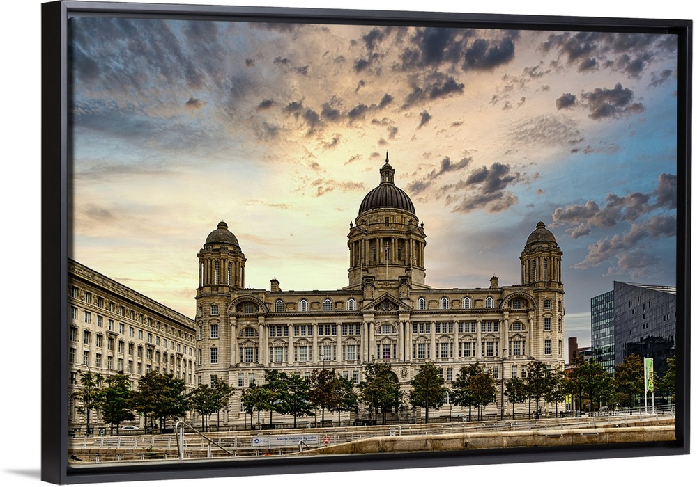 <p>Historic building with domes against a dramatic sunset sky, flanked by trees and a water feature in Liverpool, Merseyside, England, United Kingdom, Europe</p>