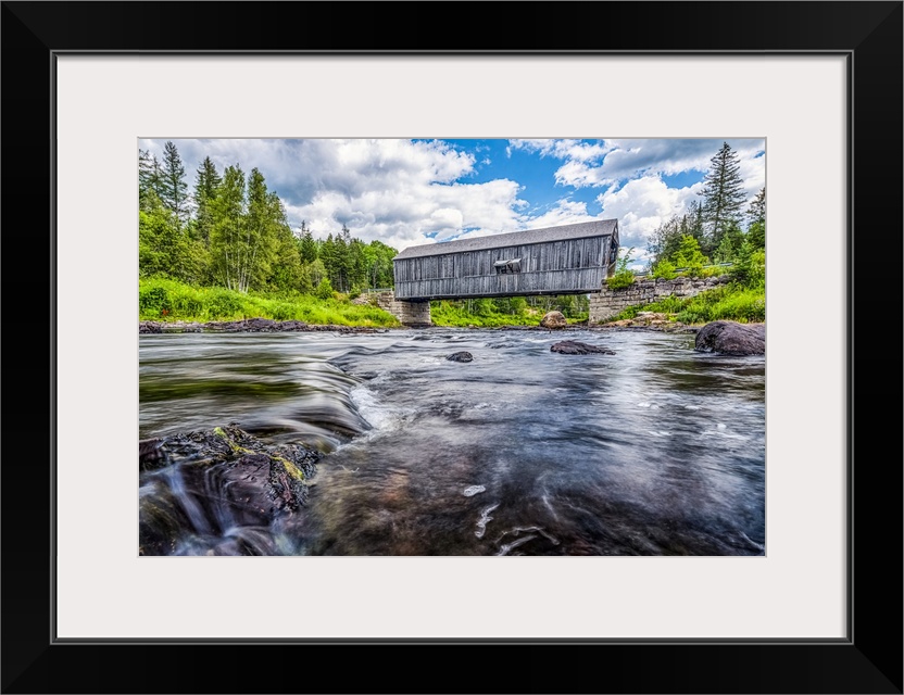 <p>Historic covered bridge over a shallow stream; Saint John, New Brunswick, Canada</p>