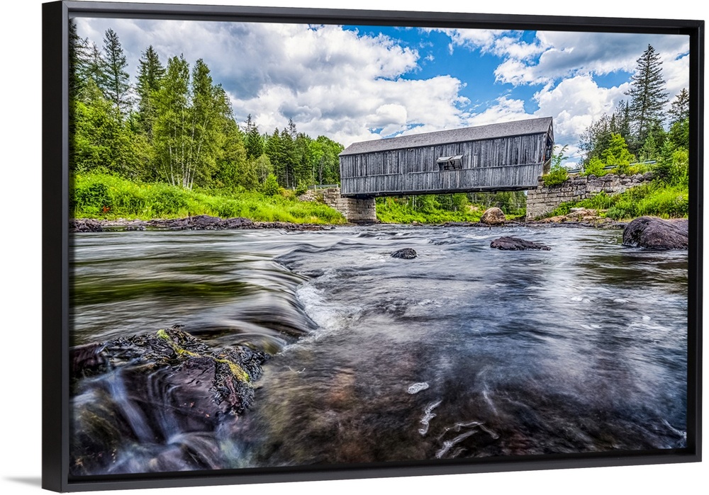 <p>Historic covered bridge over a shallow stream; Saint John, New Brunswick, Canada</p>