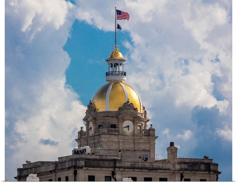<p>Historic savannah city hall clock tower and gold dome with us flag flying, savannah, georgia.</p>
