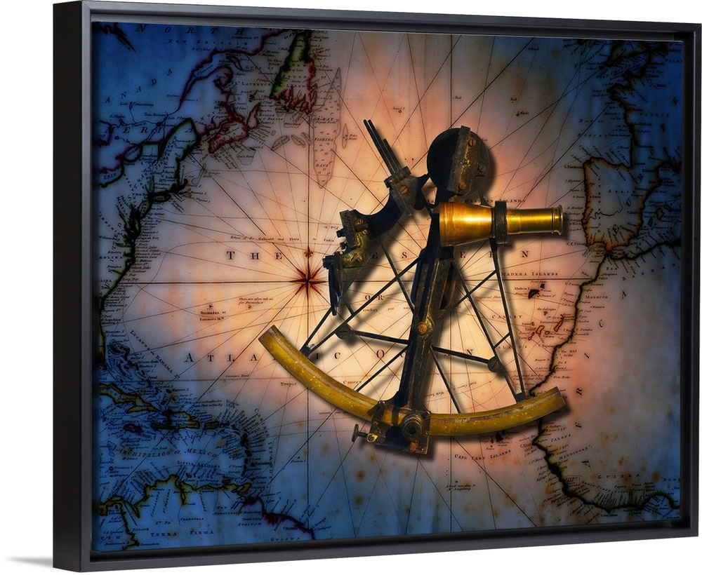 <p>Historic sextant with old world map in background</p>