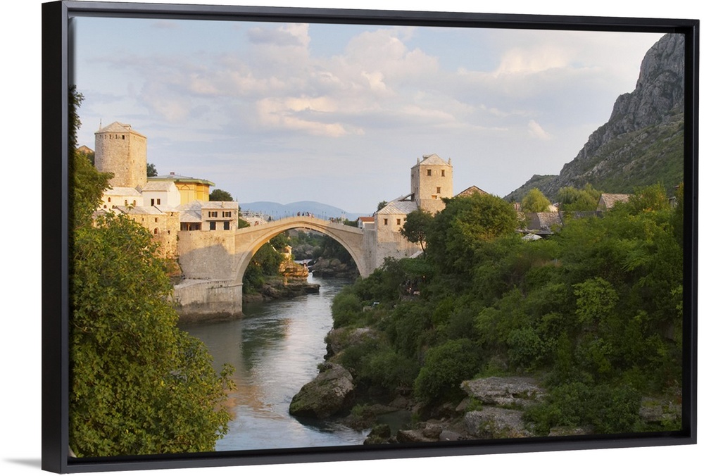 <p>View along the river of the old reconstructed bridge. Sunset late afternoon light. Sunset late afternoon light. Historic town of Mostar. Federation Bosne i Hercegovine. Bosnia Herzegovina, Europe.</p>