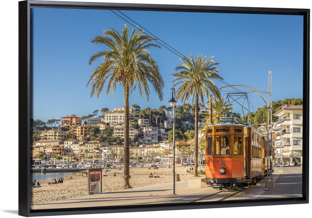 <p>Historic tram on the waterfront promenade of Port de Soller, Mallorca, Balearic Islands, Spain</p>