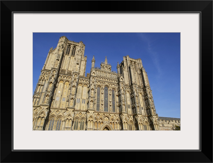 <p>The historic western facade of Wells Cathedral, with its twin square towers, in Wells, Somerset, England, United Kingdom, Europe</p>