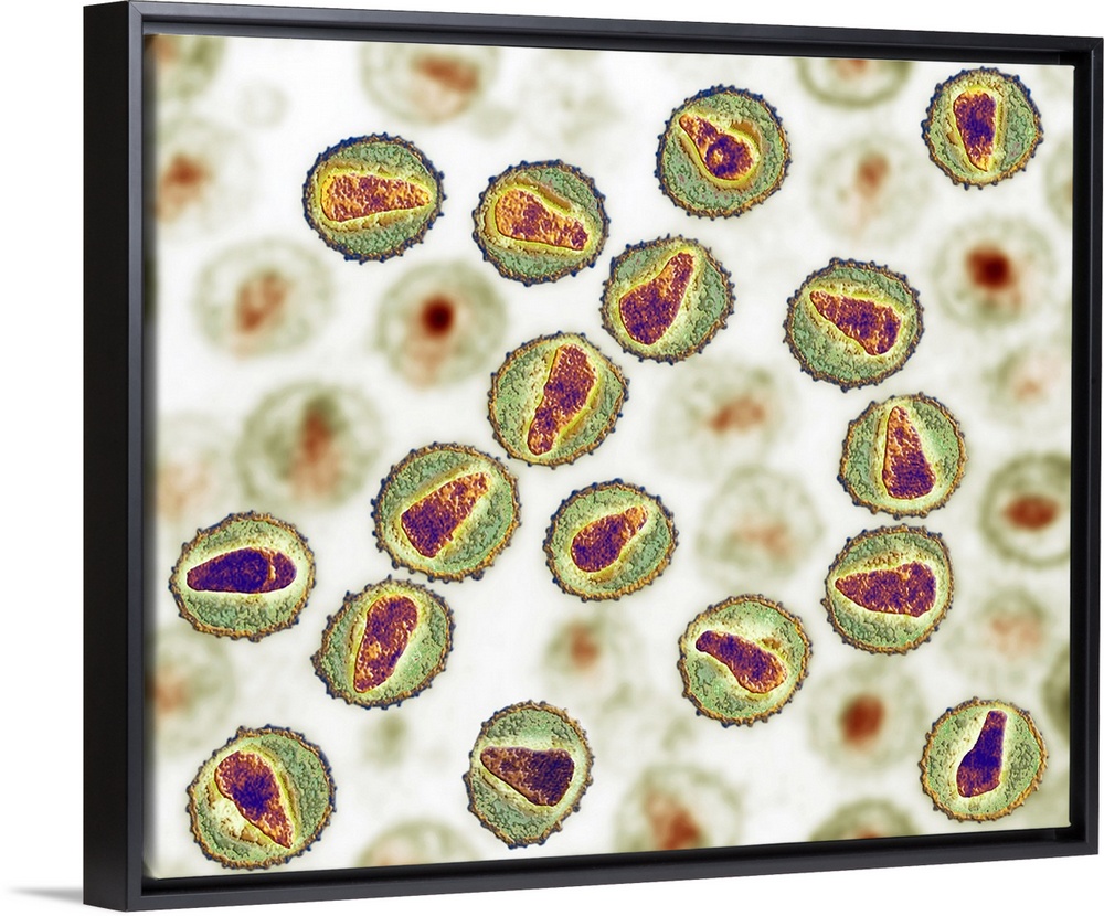 <p>HIV (human immunodeficiency virus) particles, coloured transmission electron micrograph (TEM). Each particle consists of an RNA (ribonucleic acid, purple/brown) genome, surrounded by a protein nucleocapsid (coat, yellow). This is enclosed in a matrix of proteins (green) and the whole virus is enclosed in an envelope (brown). The virus enters CD4 T-lymphocytes (white blood cells) and hijacks the host cell's machinery to copy itself. The cell dies when the virus clones burst from it, weakening the immune system and causing AIDS (acquired immune deficiency syndrome).</p>