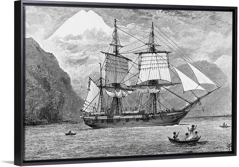 <p>1890-Illustration of the H.M.S. Beagle carrying Charles Darwin's expedition in the Straits of Magellan, Mt. Sarmiento in the distance.</p>