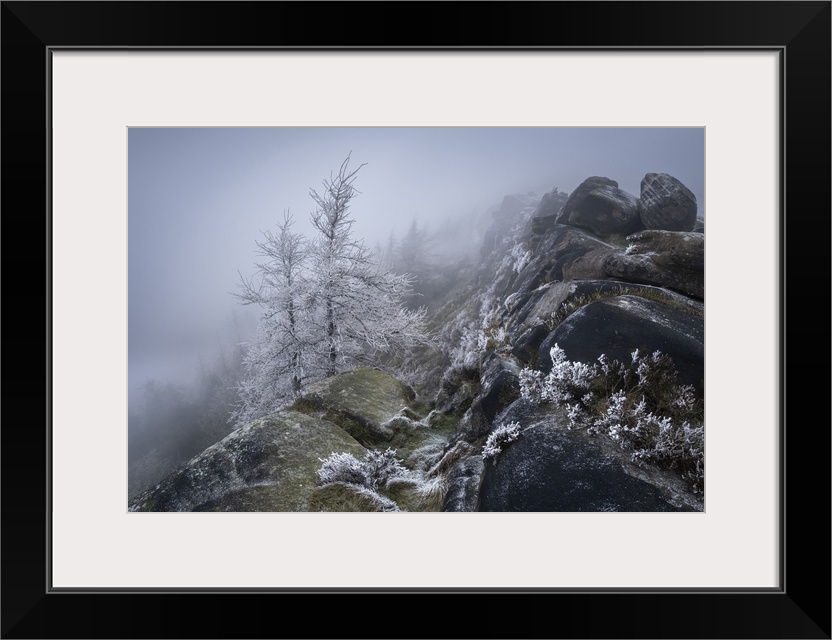 <p>Hoar frosted trees and freezing fog at The Roaches rock formation in Winter, The Roaches, near Leek, Peak District National Park, Staffordshire Moorlands, Staffordshire, England, United Kingdom, Europe</p>