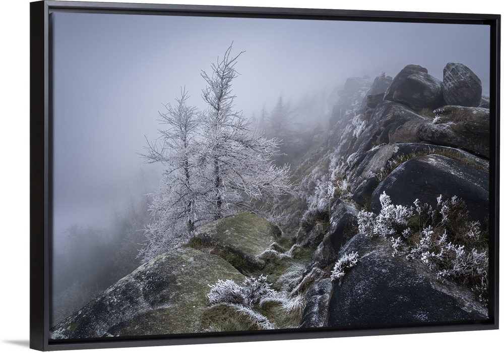 <p>Hoar frosted trees and freezing fog at The Roaches rock formation in Winter, The Roaches, near Leek, Peak District National Park, Staffordshire Moorlands, Staffordshire, England, United Kingdom, Europe</p>