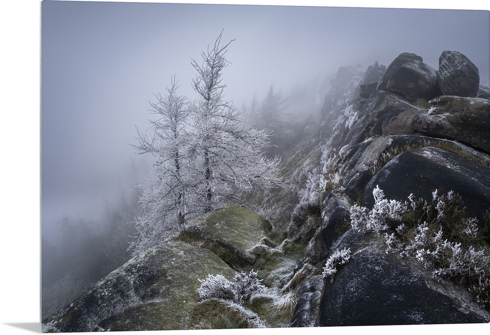 <p>Hoar frosted trees and freezing fog at The Roaches rock formation in Winter, The Roaches, near Leek, Peak District National Park, Staffordshire Moorlands, Staffordshire, England, United Kingdom, Europe</p>